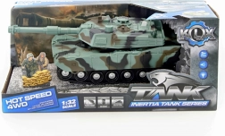 Zábavný tank pro děti od 3 let s tmavým maskováním nabízí zvuk střelby, svítící dělo a otáčecí hlaveň do všech směrů. Pohyb zajišťuje setrvačník, napájení 3× AG13 (baterie jsou součástí balení). Měřítko 1:32, rozměry cca 22 × 8 cm.