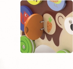 Počítání, posuvný labyrint se zvířátky, kuličkový labyrint, ozubená kola a naučné otočné prvky – vše na jedné hračce pro dlouhé hodiny objevování.
