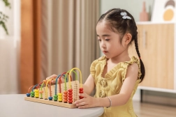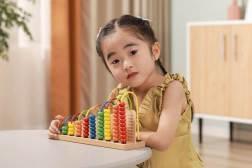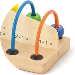 Na podstavci jsou vytištěny jednoduché příklady. Dítě posouvá korálky a přiřazuje správný počet – názorné a zábavné procvičování sčítání i odčítání.