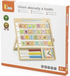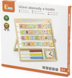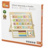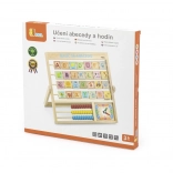 Hravé učení doplňuje praktická výuka času s přehlednými hodinami. Každé písmeno je doplněno slovem v češtině, což napomáhá lepšímu zapamatování a rozšiřování slovní zásoby.