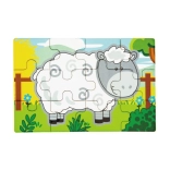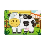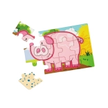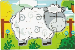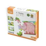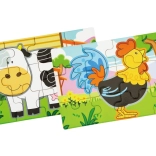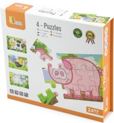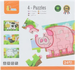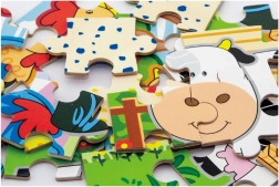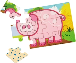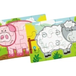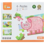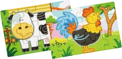 Set obsahuje čtyři samostatné puzzle s oblíbenými zvířaty z farmy – prasátko, kravičku, kohouta a ovečku. Každý obrázek má jasné barvy a jednoduché tvary pro snadné skládání.