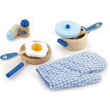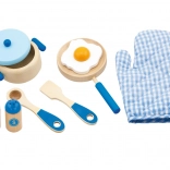 Kompletní výbava pro hru na vaření: hrnec s pokličkou, pánev s vajíčkem, lžíce, slánka, pepřenka a textilní chňapka. Ideální pro první kuchyňské dobrodružství.