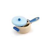 Stylová dřevěná kuchyňská sada v modrém provedení pro malé kuchaře od 24 měsíců. Obsahuje hrnec s pokličkou, pánev s vajíčkem, chňapku a další doplňky pro realistickou hru na vaření. Kvalitní dřevo, hladké hrany a bezpečné provedení podporují kreativitu, jemnou motoriku a role-play zábavu.