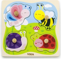 Dřevěná vkládačka VIGA se 4 velkými dílky s úchytkami je ideální první puzzle pro nejmenší. Barevné motivy hmyzu a zvířátek ze světa louky děti přirozeně motivují k objevování a učení. Vyfrézované okraje na pevné dřevěné podložce pomáhají, aby každý dílek držel spolehlivě na svém místě.