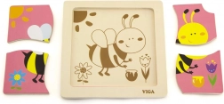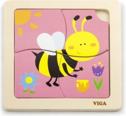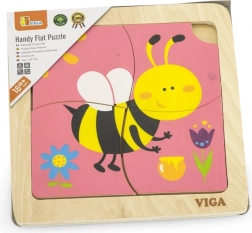 Puzzle obsahuje 4 dílky s motivem včely, které se skládají do obrázku na základní desce.