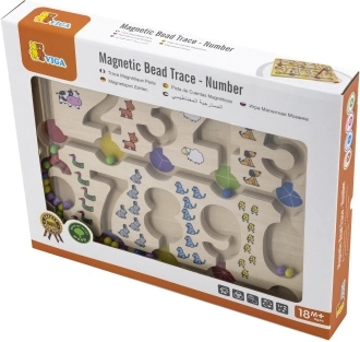 Při každé číslici je jiný obrázek zvířátka a odpovídající počet korálků, například 1 kravička, 2 pejsci, 3 ovečky atd. Deska je vybavena magnetickým perem, kterým děti mohou korálky přemisťovat. Ideální pro děti od 18 měsíců.
