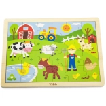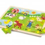 Dřevěné puzzle s farmářským motivem zobrazuje různé aspekty farmářského života, včetně zvířat a farmáře, což je atraktivní pro děti.