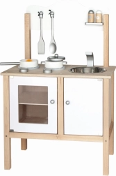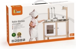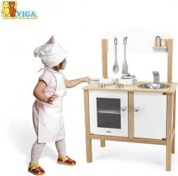 Dřevěná dětská kuchyňka značky Viga je ideální pro malé kuchaře, kteří chtějí napodobovat vaření. Tato dřevěná konstrukce s moderním bílým a přírodním dřevěným povrchem je odolná a zároveň stylová, díky čemuž se hodí do jakéhokoli dětského pokoje.