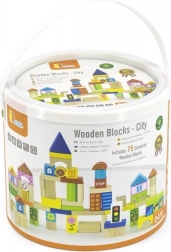 Tato dřevěná stavebnice nabízí 75 různobarevných kostek pro stavění městských scenérií. Součástí balení je i obrázková brožura s návody, která inspiruje děti k tvořivému stavění. Vše je uložené v praktickém kyblíku s rukojetí o rozměrech cca 22,5 x 20 cm.