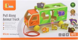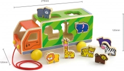 Kamion lze tahat na provázku a zároveň slouží jako chytrá vkládačka. Děti zapojují pohyb i logické myšlení při hledání správných otvorů pro zvířátka.