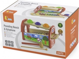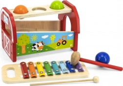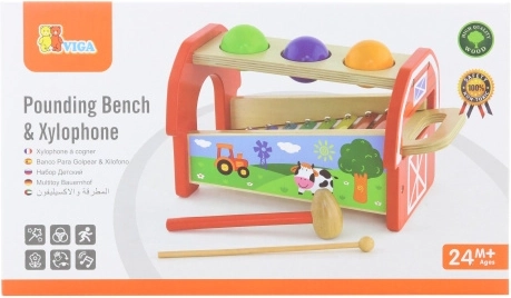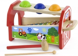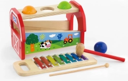 Tato dřevěná zatloukačka se xylofonem kombinuje aktivní hru s hudebním objevováním. Děti kuličky zatloukají skrz otvory, sledují jejich pohyb a poté si na barevných lamelách xylofonu vyťukají jednoduché melodie. Díky tomu si nenásilně procvičují přesnost, rytmus i trpělivost.