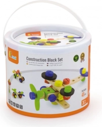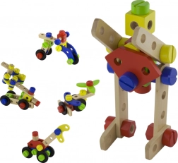 Tato dřevěná stavebnice konstruktér je ideální volbou pro první technické stavění. Děti mohou skládat své vlastní výtvory podle fantazie nebo se inspirovat přiloženou brožurou s obrázkovými návody. Kompaktní kyblík s uchem usnadňuje přenášení i ukládání, takže je stavebnice vždy po ruce a dílky se neztratí.