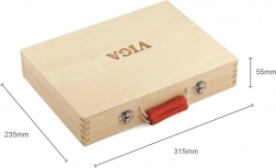 Pevný dřevěný kufřík s kovovými přezkami a červeným madlem udrží vše na svém místě, takže se žádný kousek neztratí. Díky přehlednému uspořádání má každé náčiní své místo a celá sada je snadno přenosná na návštěvy, cesty i do dětského pokoje.