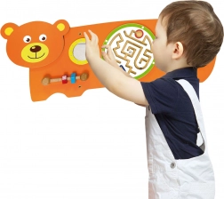 Smyslová tabule Medvídek je navržena podle principů Montessori tak, aby děti přirozeně motivovala k objevování a procvičování dovedností. Nabízí více druhů aktivit: otáčení ozubených kol, vedení kuličky v labyrintu, pozorování v bezpečném zrcátku a trénink úchopu pomocí šroubků na závitu. Díky robustní dřevěné konstrukci a možnosti nástěnné instalace se skvěle hodí do dětských pokojíčků, heren i mateřských škol.