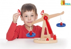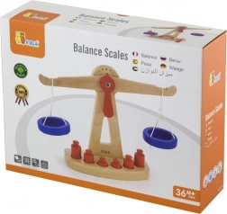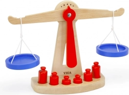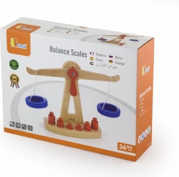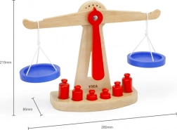 Dřevěná balanční váha značky Viga je vybavena dvěma modrými miskami zavěšenými na provázcích a obsahuje šest červených závaží různých velikostí. Díky svému barevnému designu a bezpečné povrchové úpravě přináší tato váha dětem spoustu zábavy. Váha je navržena tak, aby děti motivovala používat svou představivost a fantazii při hře na obchod, což jim pomůže pochopit základní matematické koncepty a hodnotu rovnováhy.