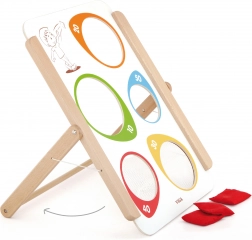 Hra obsahuje stojan s dřevěným rámem a tři pytlíky s fazolemi, které lze snadno přenést díky skládací konstrukci.