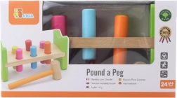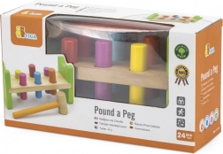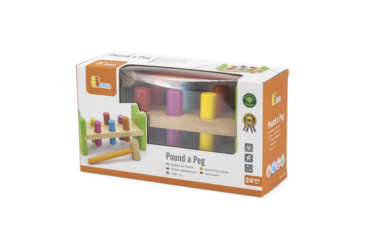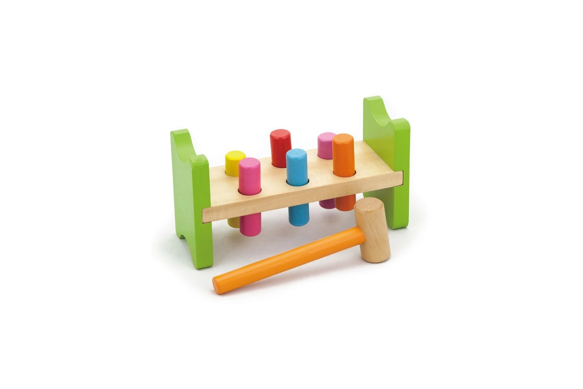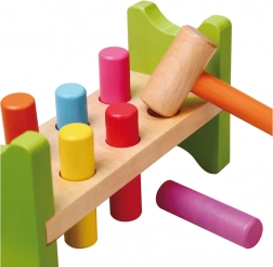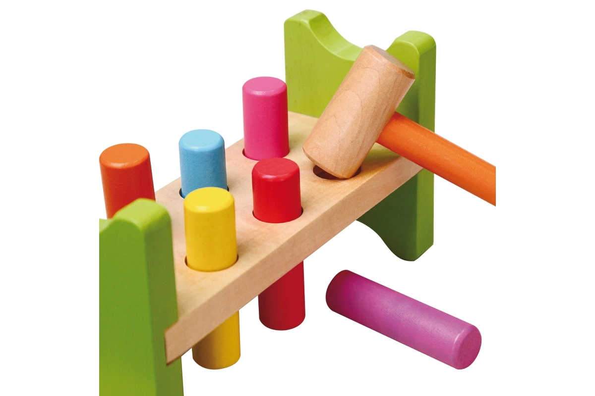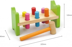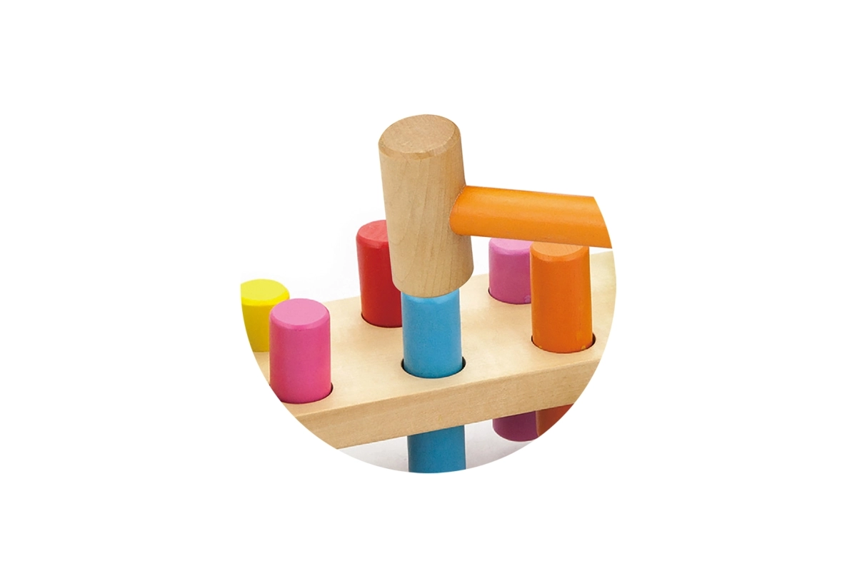 Součástí je dřevěné kladívko a vícebarevné kolíky pro dlouhotrvající zábavu.