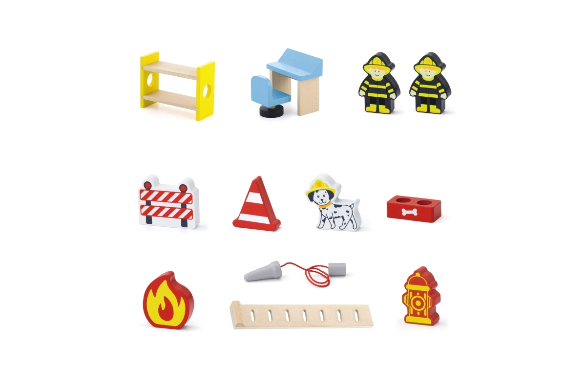 V balení najdete vše pro okamžité hraní: budovu stanice, 2 hasiče, vrtulník, hasičské auto, hydrant, palandu, židli, ovládací panel a žebřík. Materiály a barvy jsou bezpečné a netoxické, aby si děti mohly hrát bez starostí. Ideální jako dárek, který potěší a zároveň vydrží.