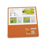 Rozměr složeného obrázku je cca 22,5 × 22,5 cm, což je praktická velikost pro hraní na stole i podlaze. Puzzle je vhodné pro děti od 18 měsíců a pomáhá rozšiřovat slovní zásobu při pojmenovávání zvířátek.
