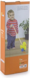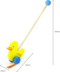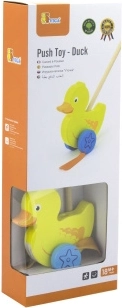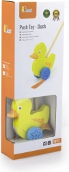 Dřevěný tlačný kačer na tyči je jednoduchou, ale účinnou hračkou, kterou si oblíbí každé dítě. Je to klasická hračka, která přináší mnoho výhod. Roztomilý žlutý kačer při pohybu energicky pohybuje nožičkami, což děti motivuje k procházkám. Tato hračka je balena v estetické krabici s okénkem, které umožňuje vidět kachničku. Uvnitř je tyč s úchytem, která dokonale padne do malé ručky dítěte. Tyč není trvale připevněná, což usnadňuje její skladování. Celá hračka je vyrobena z bukového dřeva a natřena netoxickými barvami v živých barvách, které přitahují pozornost a povzbuzují k hraní, což přináší hodně radosti z hraní.