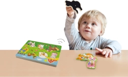 Po vložení každého dílku se ozve autentický zvuk zvířete. Děti si tak lépe propojí obraz, tvar a zvuk a učení je baví.