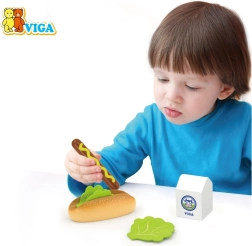 Tato kvalitní dřevěná sada VIGA přináší dětem realistickou hru na vaření. Hot dog s houskou, salátem a hořčicí spolu s „krabicí mléka“ rozvíjí kreativitu a učí děti základům sociální hry. Díky pevnému dřevěnému zpracování je set ideální pro každodenní hraní.