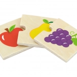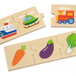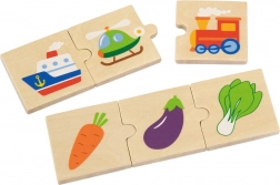 Děti spojují dílky do logických trojic (ovoce, zelenina, zvířata, vozidla), čímž si upevňují chápání souvislostí a rozvíjejí slovní zásobu i logické myšlení.