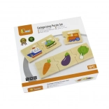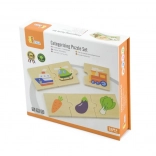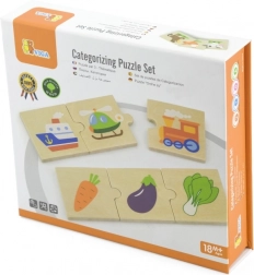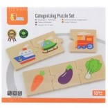 Dřevěné logické puzzle VIGA propojují zábavu s učením. Děti spojují 24 dílků do 8 smysluplných trojic – například tři zvířátka, tři dopravní prostředky nebo tři druhy zeleniny. Tím si přirozeně procvičují rozpoznávání kategorií, soustředění i slovní zásobu.