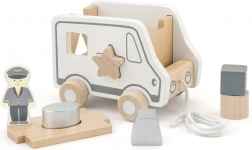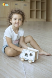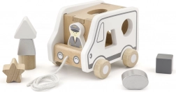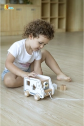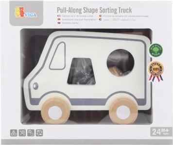 Tato dřevěná tahačka ve tvaru nákladního auta spojuje dvě oblíbené aktivity – tahání na provázku a vkládání tvarů. Děti rozvíjejí poznávání tvarů a prostorové vnímání, zatímco si užívají pohyb a fantazijní hru s roztomilým autíčkem.