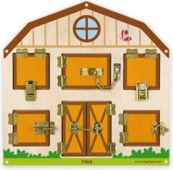 Tato kvalitní dřevěná hra ve tvaru domečku nabízí několik dvířek s různými typy zámků – háčky, petlice, řetízky či posuvné západky. Při každém otevření na děti čeká překvapení v podobě ilustrovaných zvířátek, což podporuje zvídavost, soustředění a koordinaci oko–ruka.