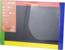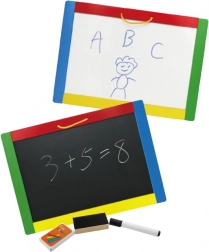 Tato univerzální tabule spojuje dvě kreativní plochy v jednom – černou magnetickou stranu pro křídy a bílou stíratelnou stranu pro fixu. Děti mohou psát, kreslit i trénovat písmenka a číslice; na černé straně navíc snadno přichytí magnetky. V balení najdete vše pro okamžité použití: 4 křídy, stíratelnou fixu a houbičku.
