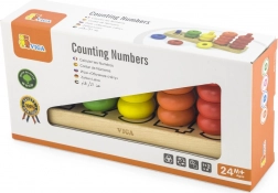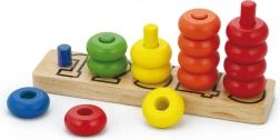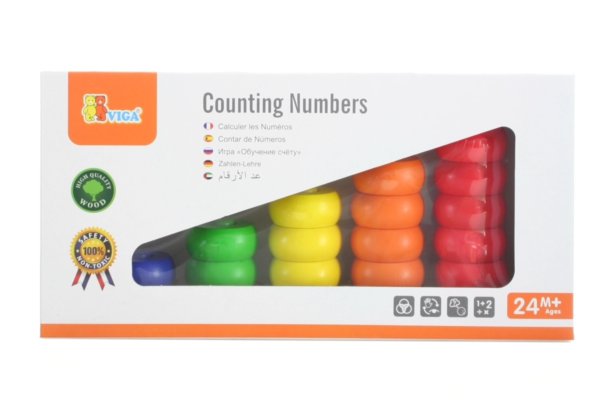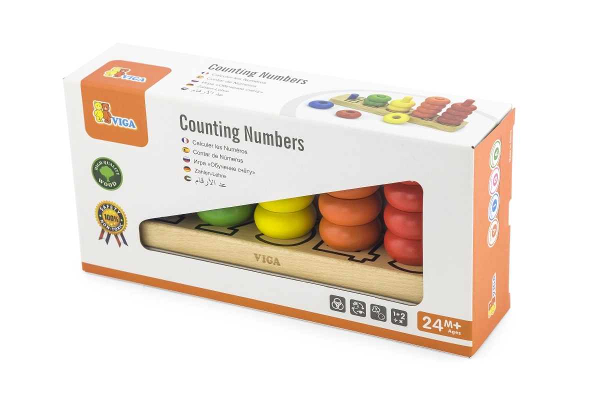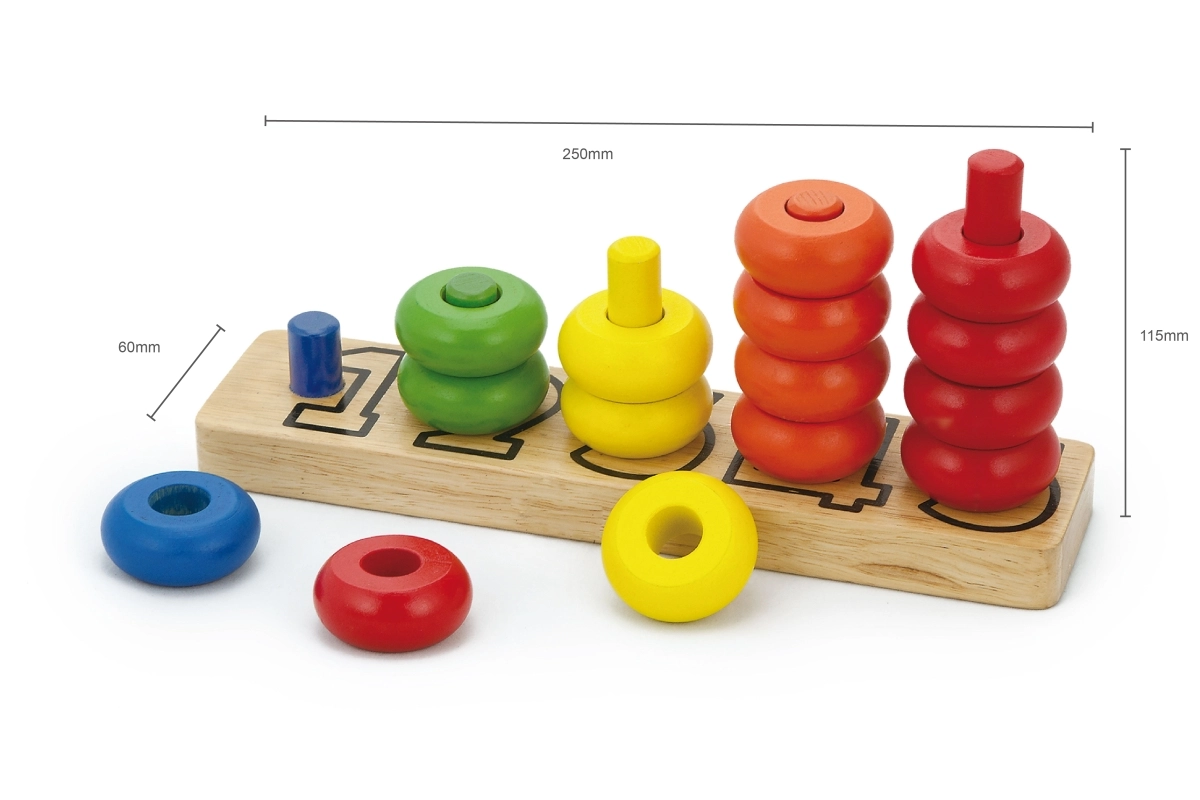 Toto odolné dřevěné počítadlo nabízí dětem bezpečnou a intuitivní formu učení. Na pevné základně jsou svislé kolíky, na které děti navlékají barevné kroužky, třídí je podle barvy a množství a procvičují první početní dovednosti. Hračka podporuje logické myšlení a koncentraci.