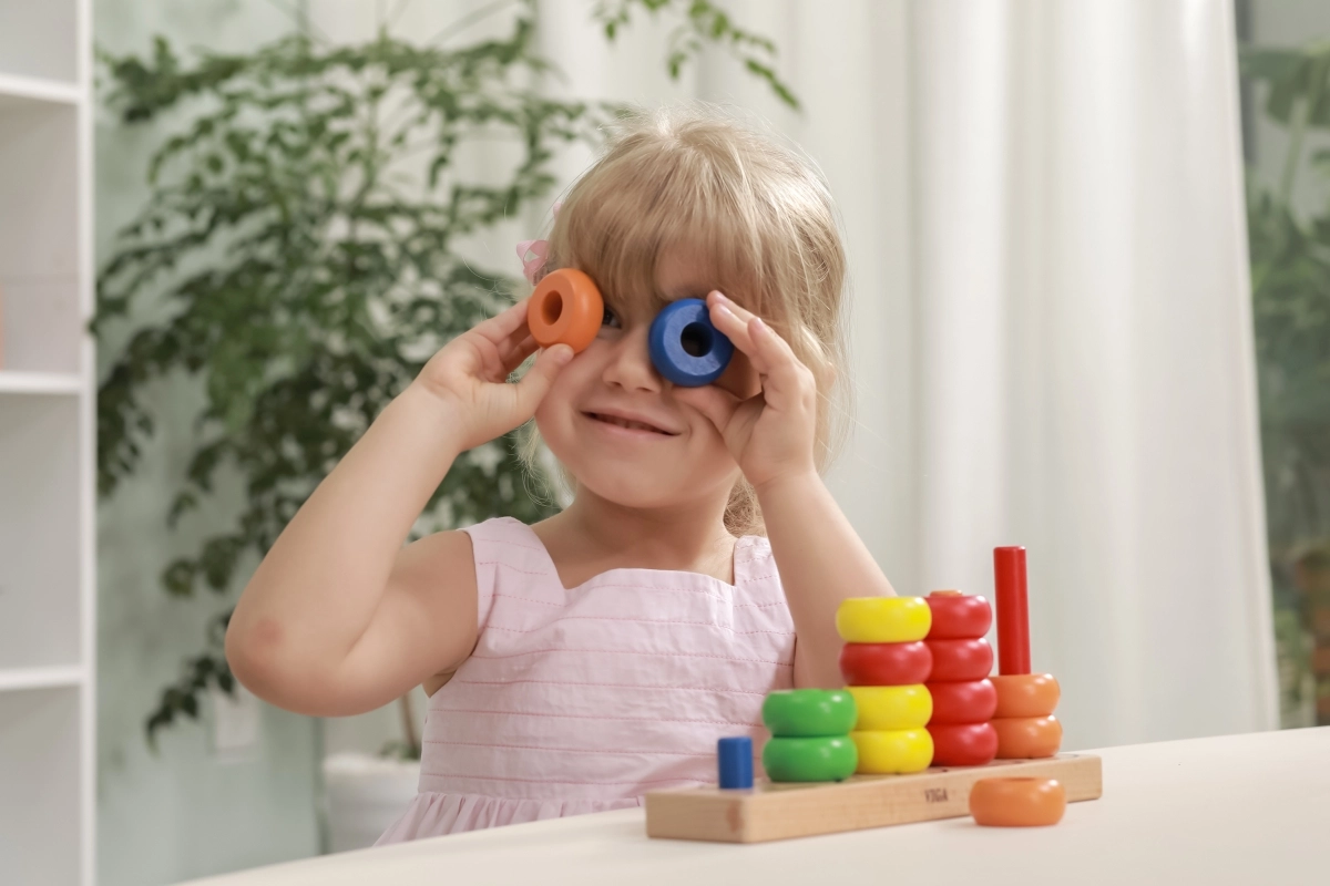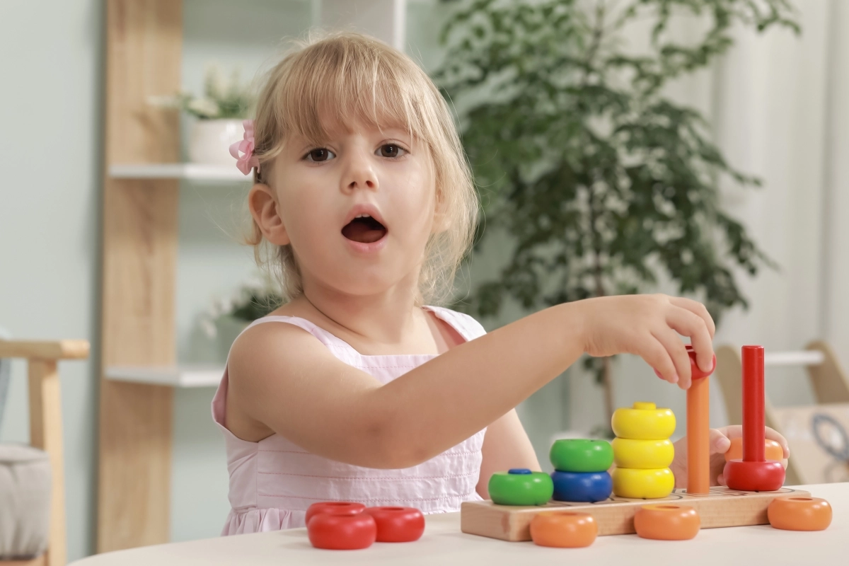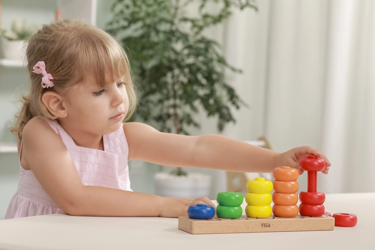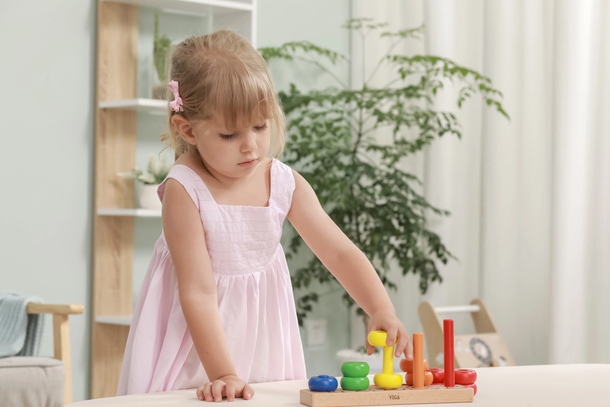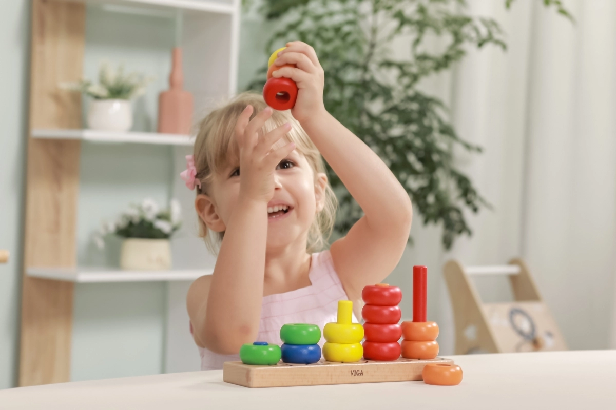 Navlékání kroužků podporuje přesnost pohybů, trpělivost a soustředění – ideální pro předškoláky.