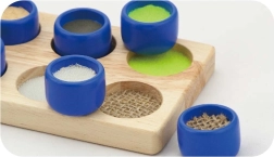 Tento dřevěný hmatový třídicí set kombinuje oblíbené principy sorterů s hlubší sensorickou stimulací. Deska s deseti otvory a sada deseti válců s různými povrchy a materiály podporují soustředění, logické uvažování a rozvoj jemné motoriky.