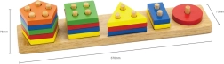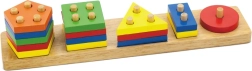 Tato pevná dřevěná vkládačka kombinuje třídění a navlékání tvarů na kolíky. Děti se učí rozlišovat barvy a geometrické tvary, procvičují koordinaci oko–ruka a zlepšují zručnost při manipulaci s dílky. Dřevo je hladce broušené a barvy jsou výrazné a atraktivní.