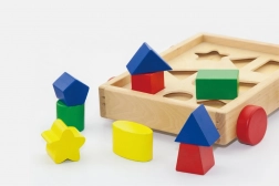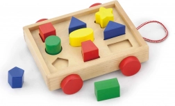Vozík obsahuje různé geometrické tvary, které umožňují dětem zábavně se učit rozpoznávat různé tvary.