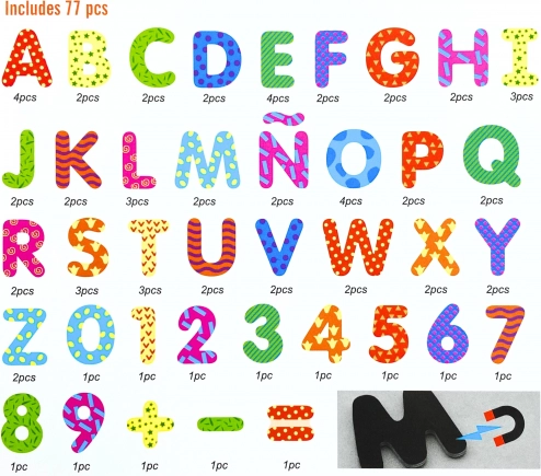 - 77 dílů: písmena, číslice a matematické znaky (+, −, =)