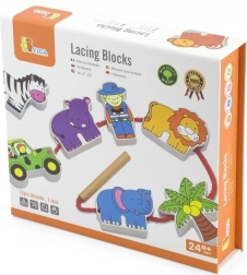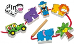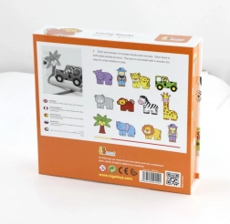 Sada obsahuje dřevěné kostky, které zobrazují obyvatele safari včetně lamparta, palmy, opice, hrocha, zebry, jeepu, žirafy, medvěda, lva, slona a průvodce. Kostky jsou precizně malovány z obou stran netoxickými barvami a přináší dětem mnoho radosti při hraní. Všechny prvky jsou navrženy tak, aby podporovaly rozvoj jemné motoriky a znalosti zvířecího světa.