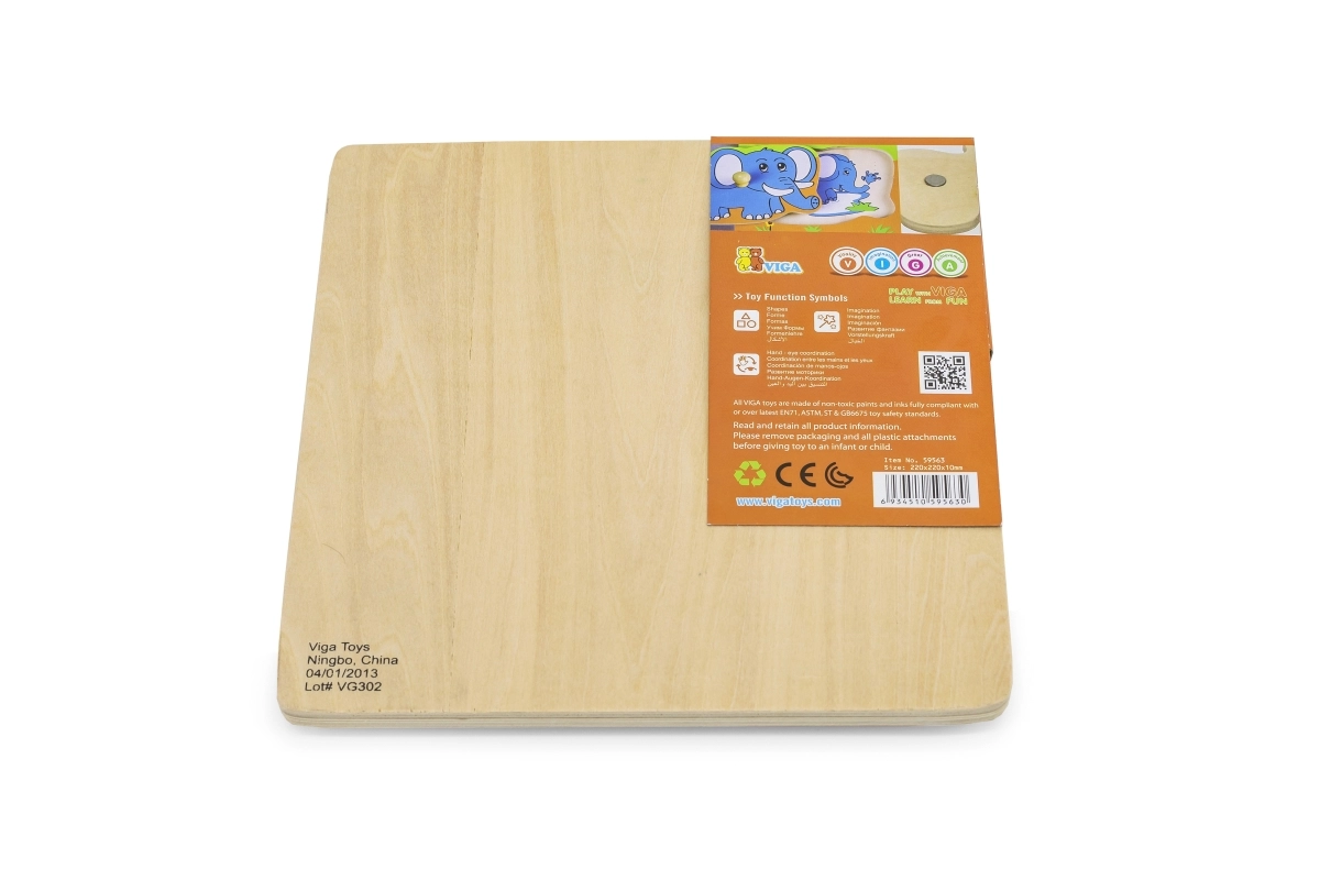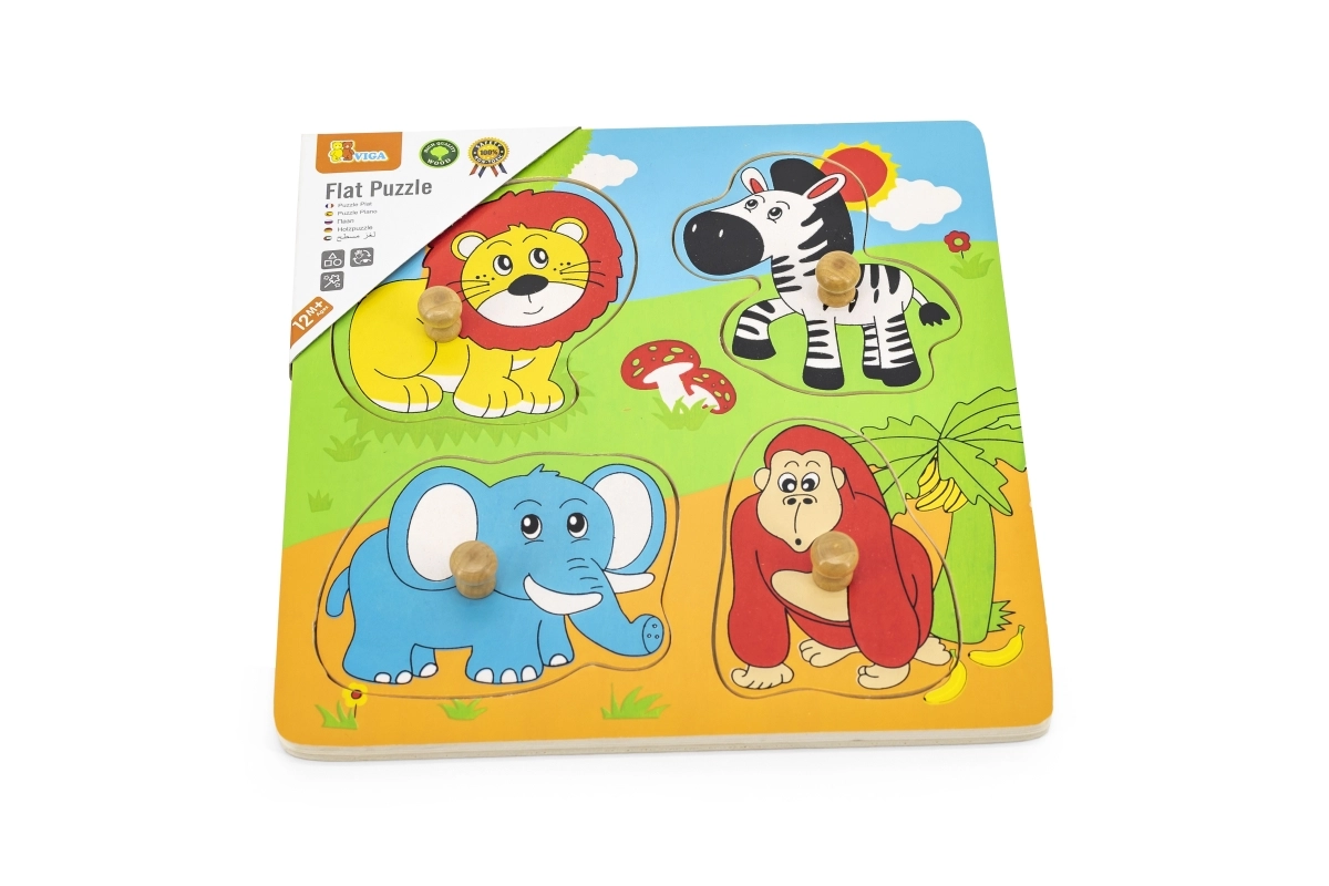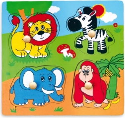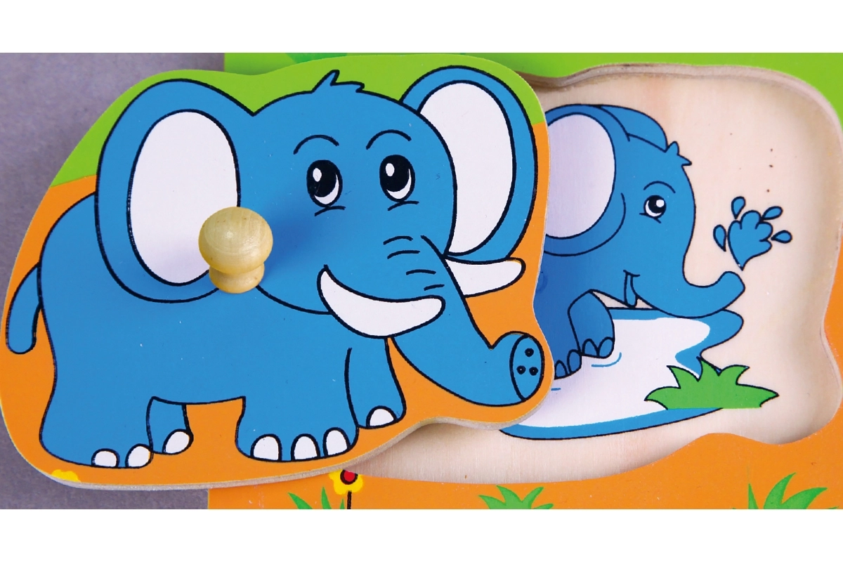 Tato kvalitní dřevěná vkládačka se safari motivem je ideální první skládačka pro batolata. Každý dílek má dřevěný kolíček pro snadné uchopení malými ručkami a odpovídající siluetu na podkladové desce pro snazší orientaci.