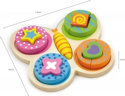 Rozkošné dřevěné puzzle ve tvaru motýlka přináší dětem od 2 let hodiny zábavy i učení. Díky jasným barvám, velkým bezpečným dílkům a vyfrézovaným okrajům díly skvěle drží na místě. Hračka podporuje jemnou motoriku, koordinaci oko–ruka a tvořivost.
