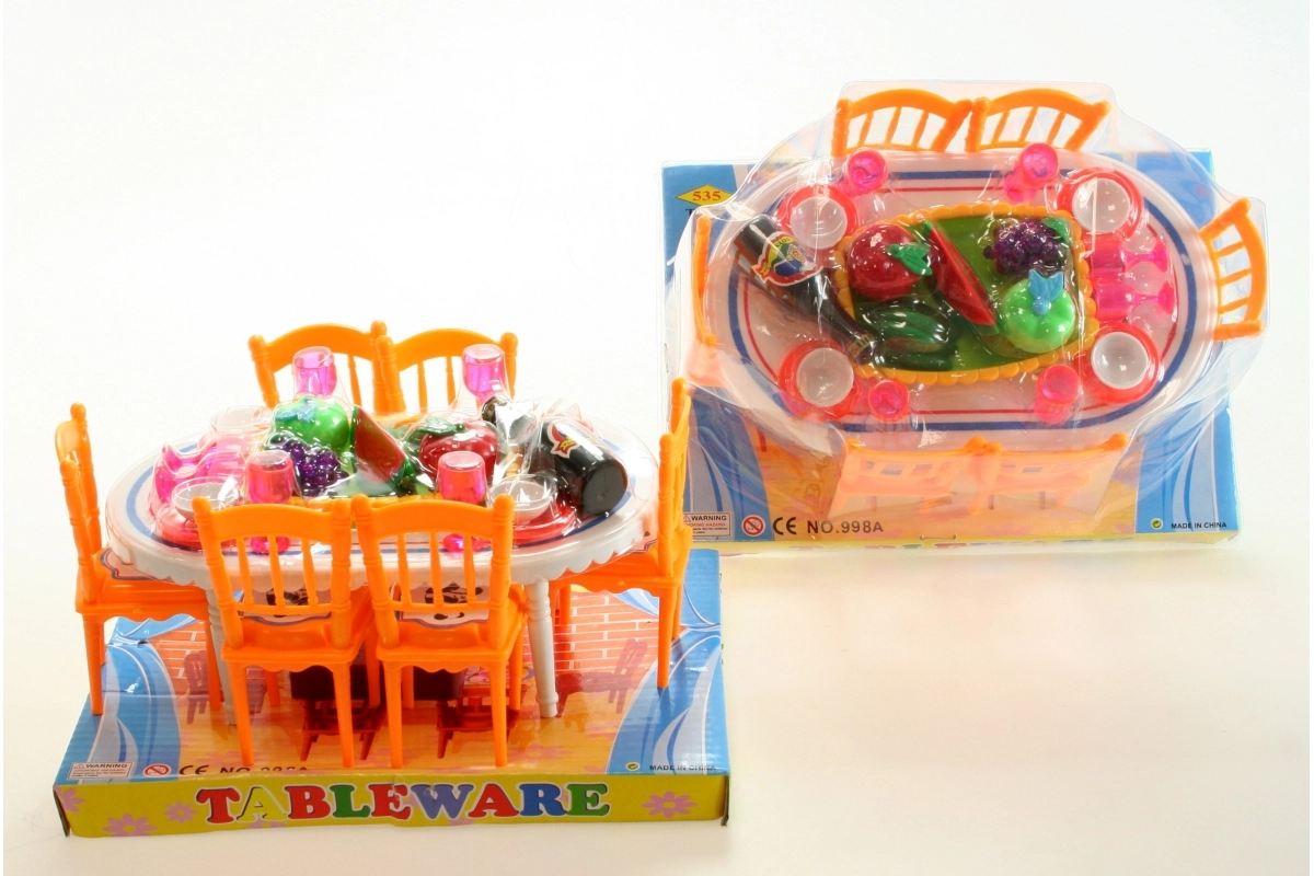 Stoleček s jídlem pro panenky se židličkami a nádobím