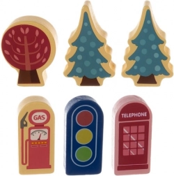 Součástí jsou také doplňky jako dřevěné figurky postav, vozidel a dekorační prvky jako stromy a pouliční prvky. Velmi detailní design propůjčuje celé hře realistický pocit a výborně zabaví děti všech věkových kategorií.