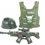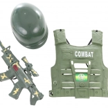 Obsahuje vojenskou helmu, vestu a samopal, navrženo pro realistické herní zážitky.