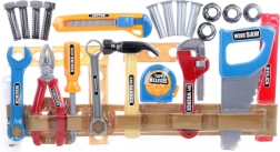 Set obsahuje pilku, kleště, kladívko, hasák, šroubovák, klíč, nožík a praktický pás pro přehledné uložení nářadí. Hra podporuje rozvoj jemné motoriky, koordinaci oko–ruka a učí děti samostatnosti a praktickému myšlení.
