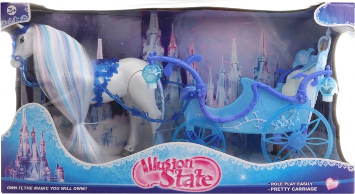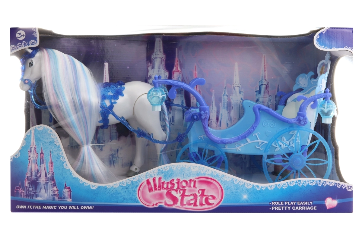 Okouzlující hračka pro malé milovníky pohádek: kůň s modrým kočárem, který po vložení baterií chodí, hraje melodie a na kočáře mu svítí lucerničky. Ideální dárek pro děti od 3 let.