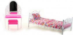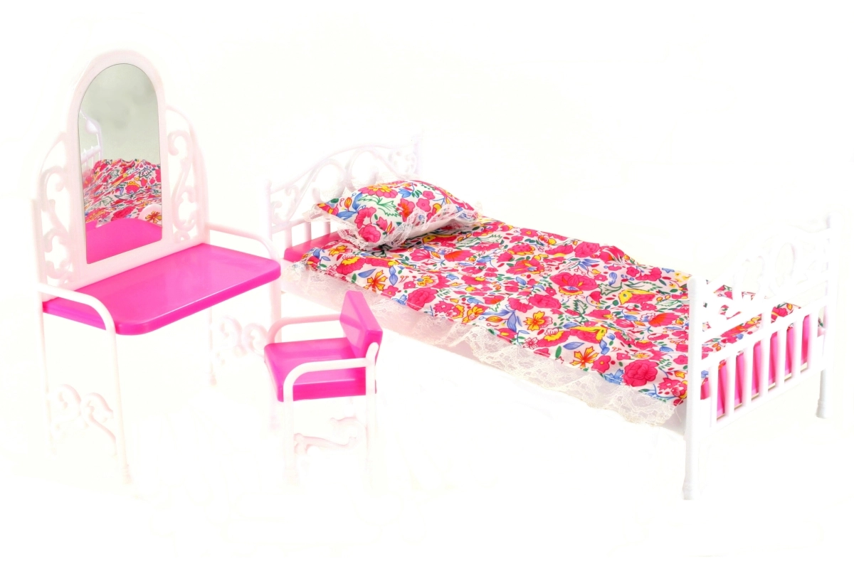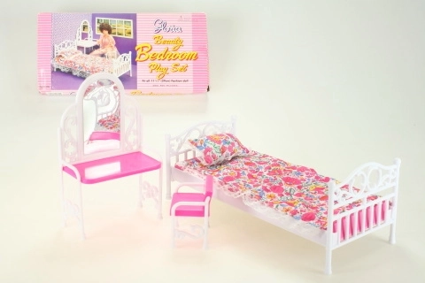 Objevte půvabnou sadu Glorie, která přináší postel pro panenky s měkoučkým přehozem a polštářkem, toaletní stolek se zrcadlovou fólií a praktickou židličku. Skvěle se hodí k většině běžných panenek a doplní jejich pokojíček o útulné místo na odpočinek i parádění.