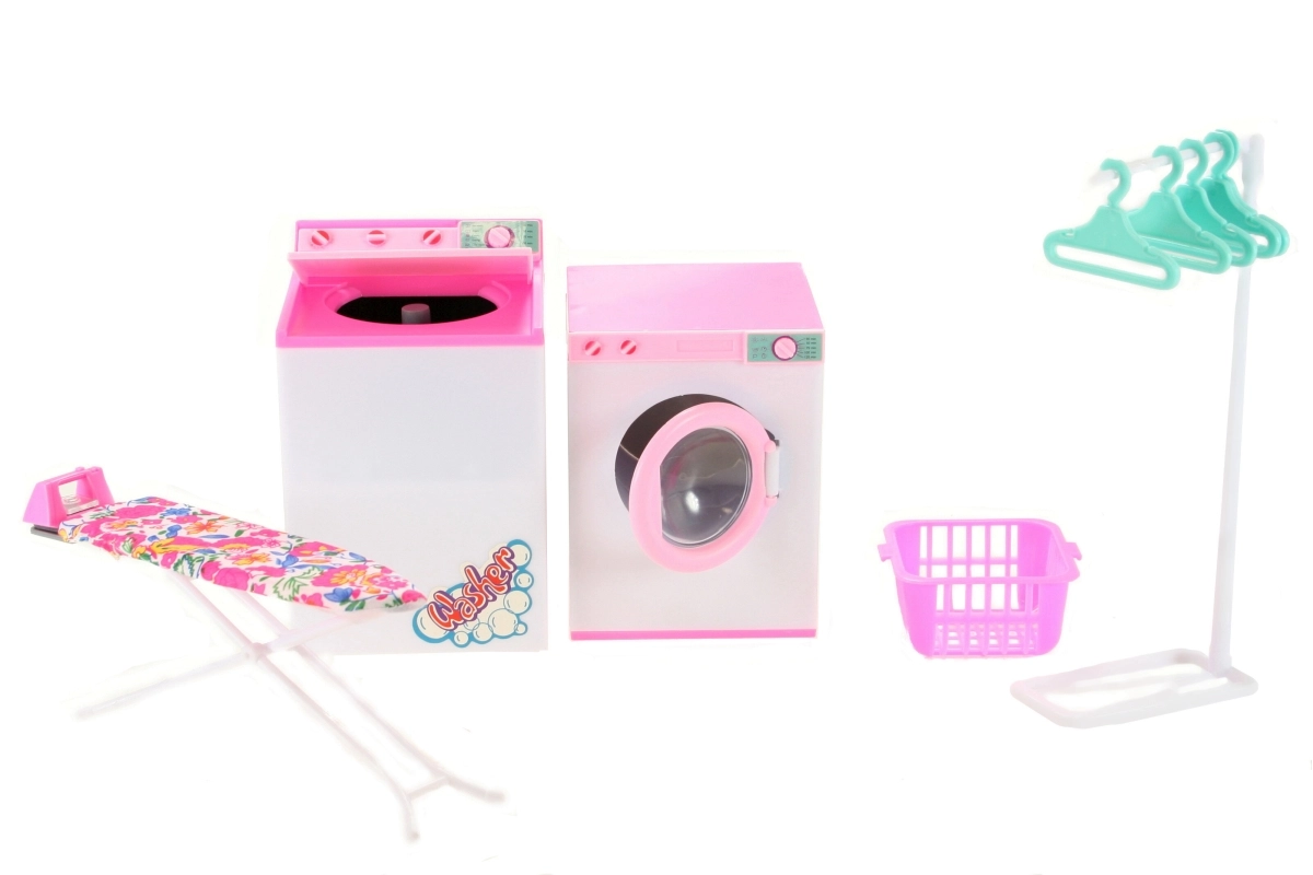 - Obsah sady: pračka (otevírací přední víko), sušička (otevírací horní víko), žehlicí prkno, žehlička pro panenky, stojan na šaty s 5 ramínky, košík na prádlo