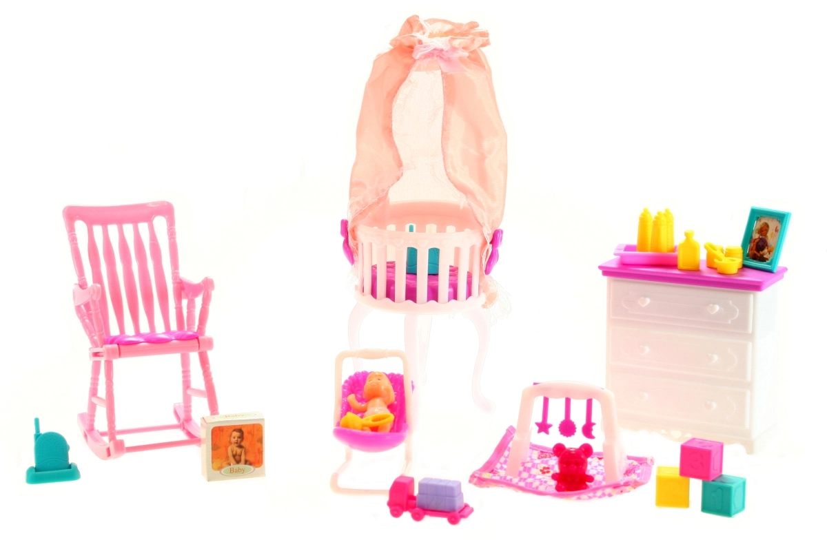 Komoda se šuplíkem, postýlka s nebesy, dětské lehátko, houpací křeslo, dětské hračky a potřeby, chůvička (obrázek), miminko