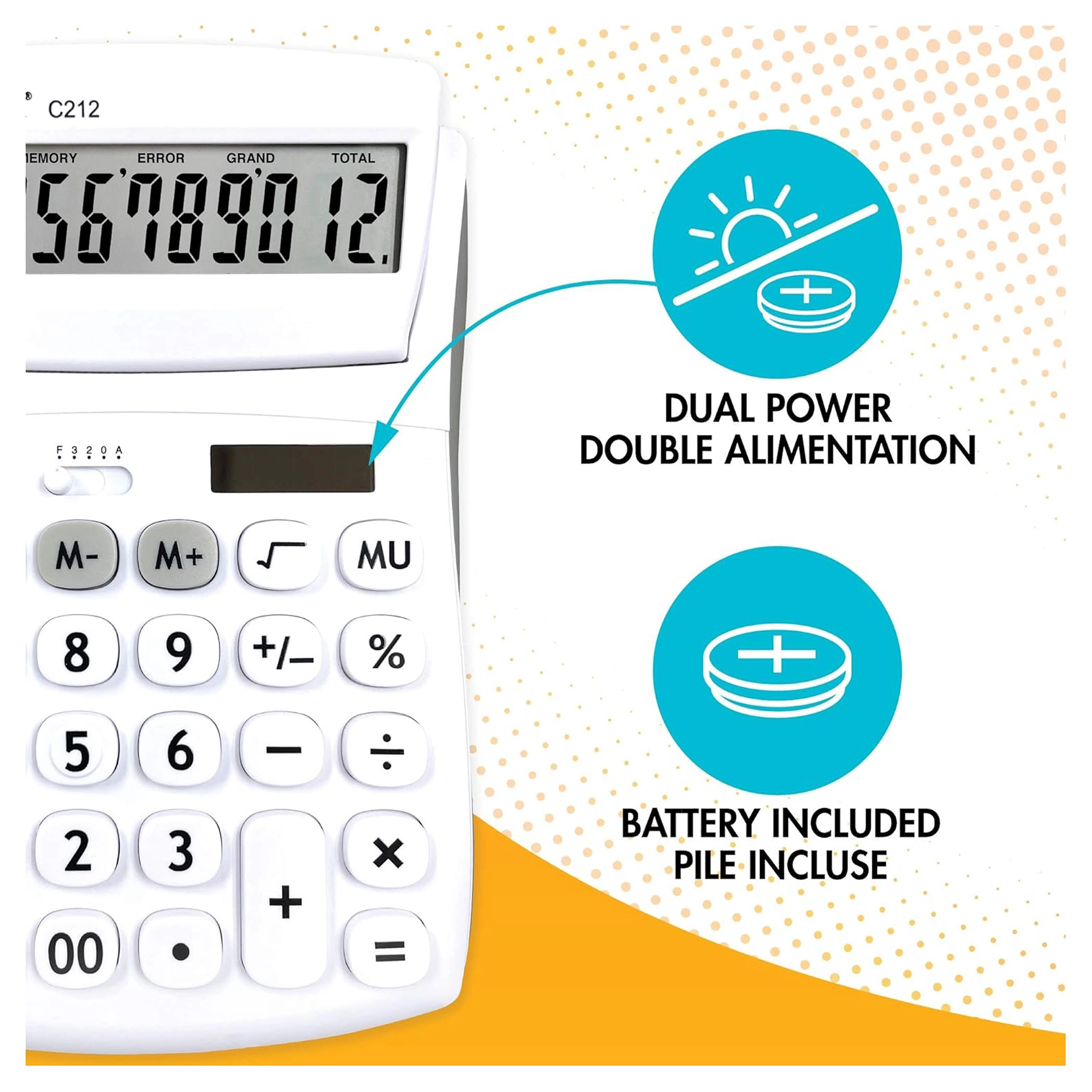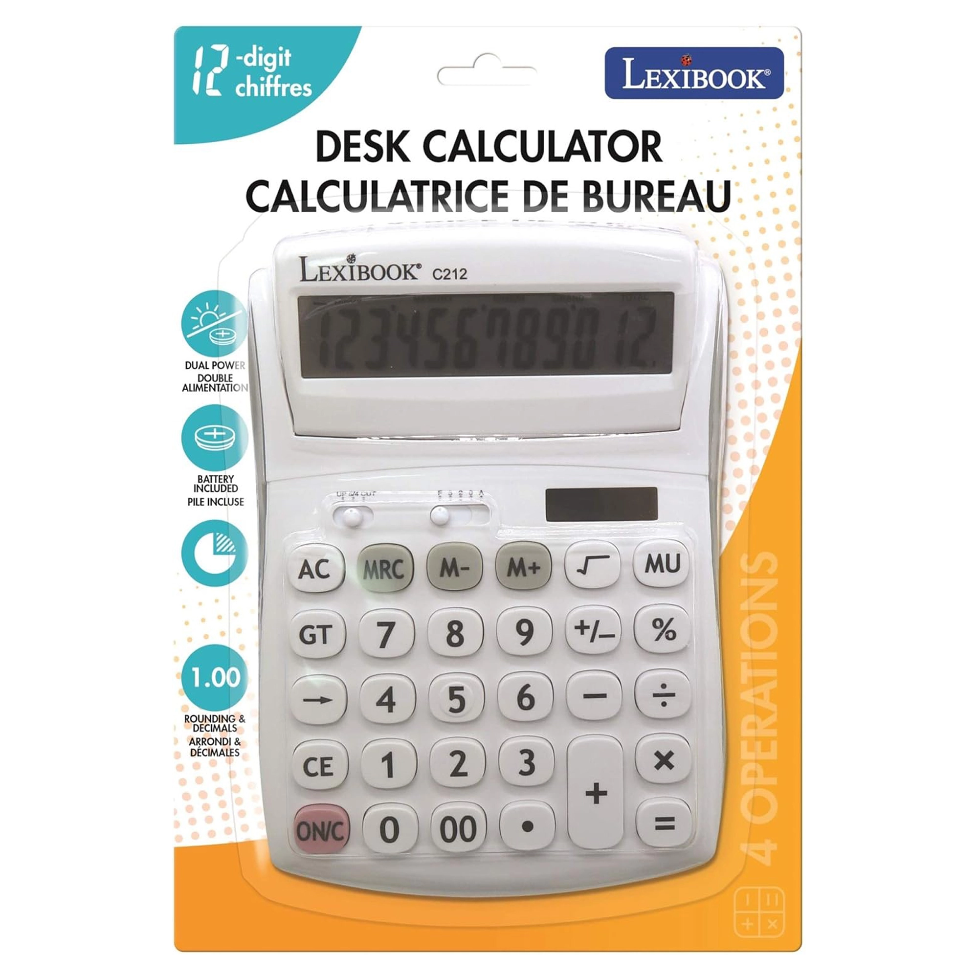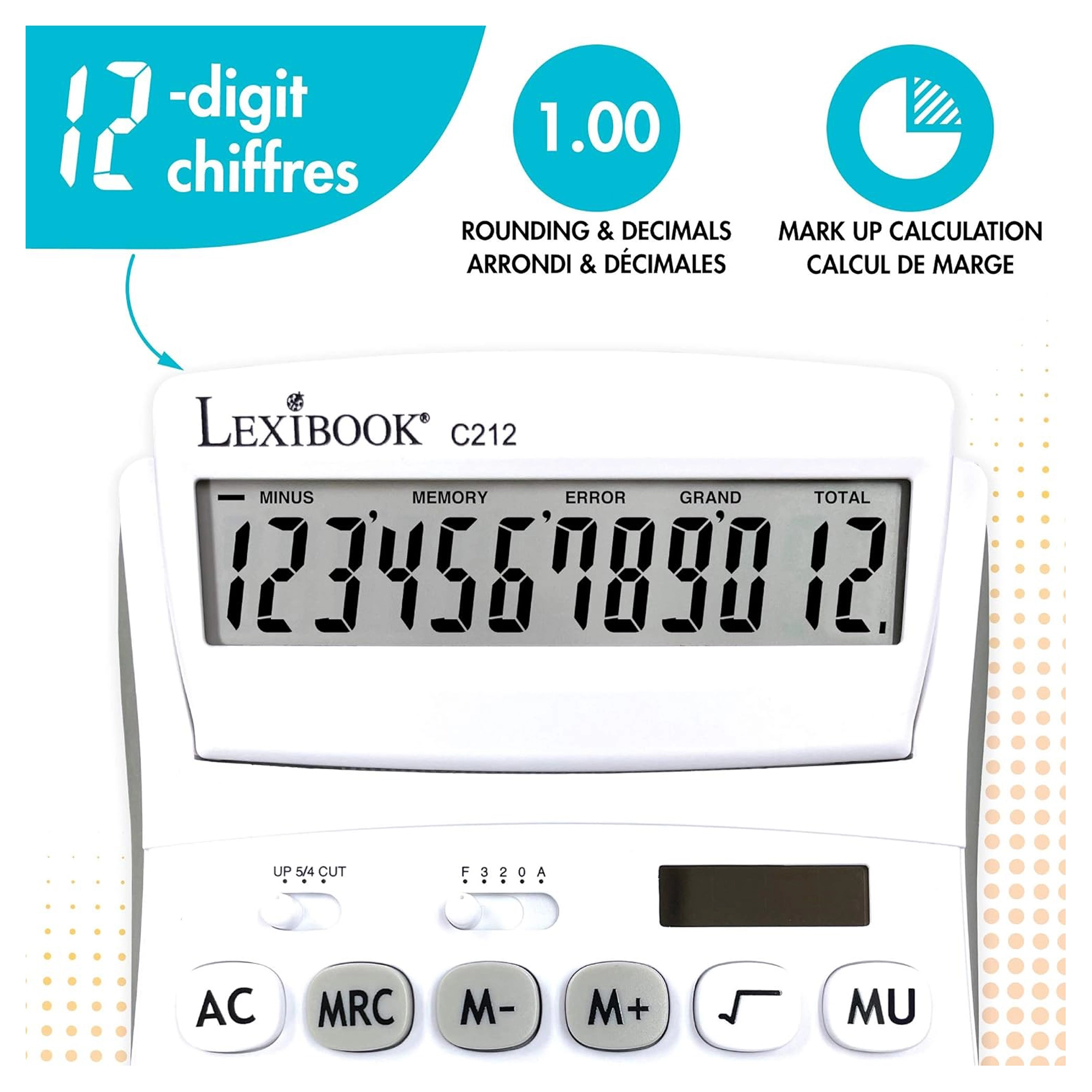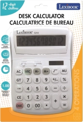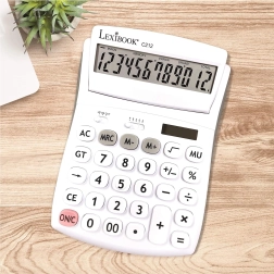 Praktická 12místná stolní kalkulačka pro kancelář, školu i domácnost nabízí velký výklopný displej, odolná pogumovaná tlačítka a duální napájení (baterie AG10 + solární). Umožňuje volbu desetinných míst a zaokrouhlování, má paměť na 3 čísla, funkce procent, odmocniny a výpočtu marže a nechybí opravné tlačítko pro smazání posledních číslic.