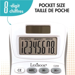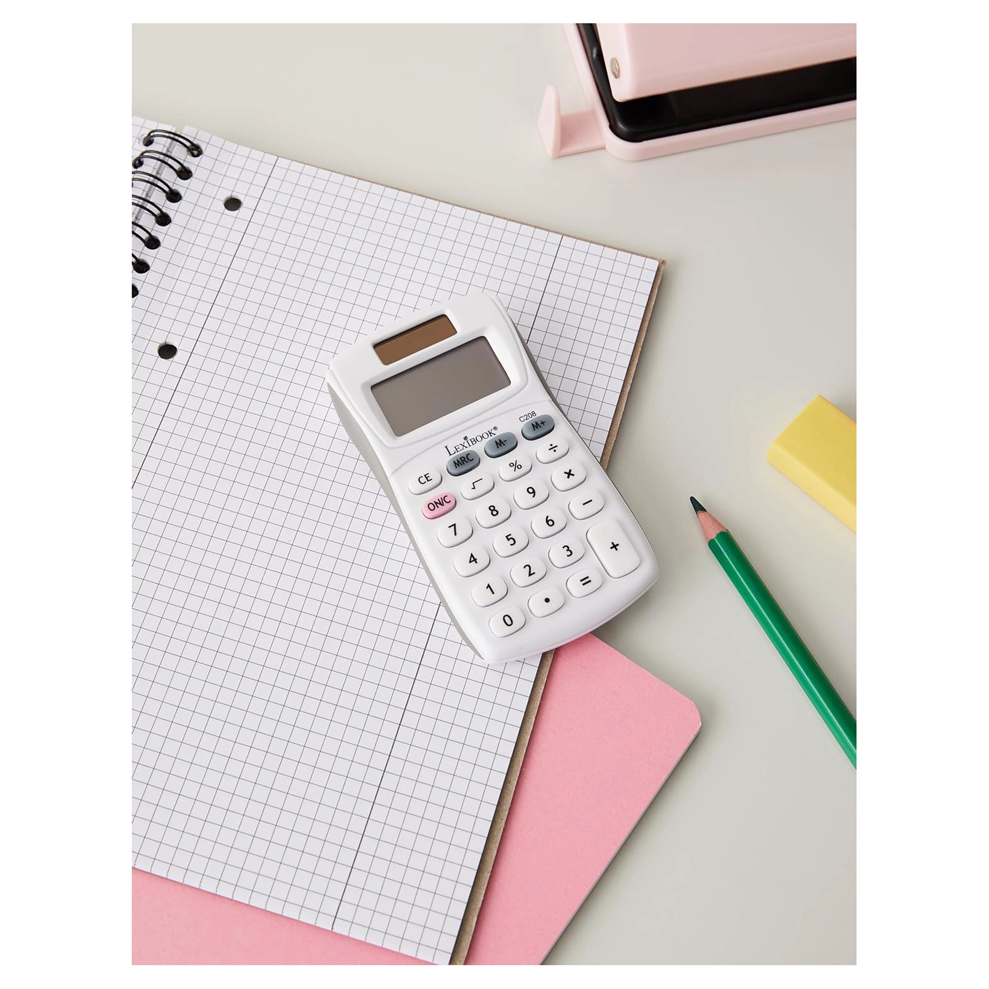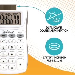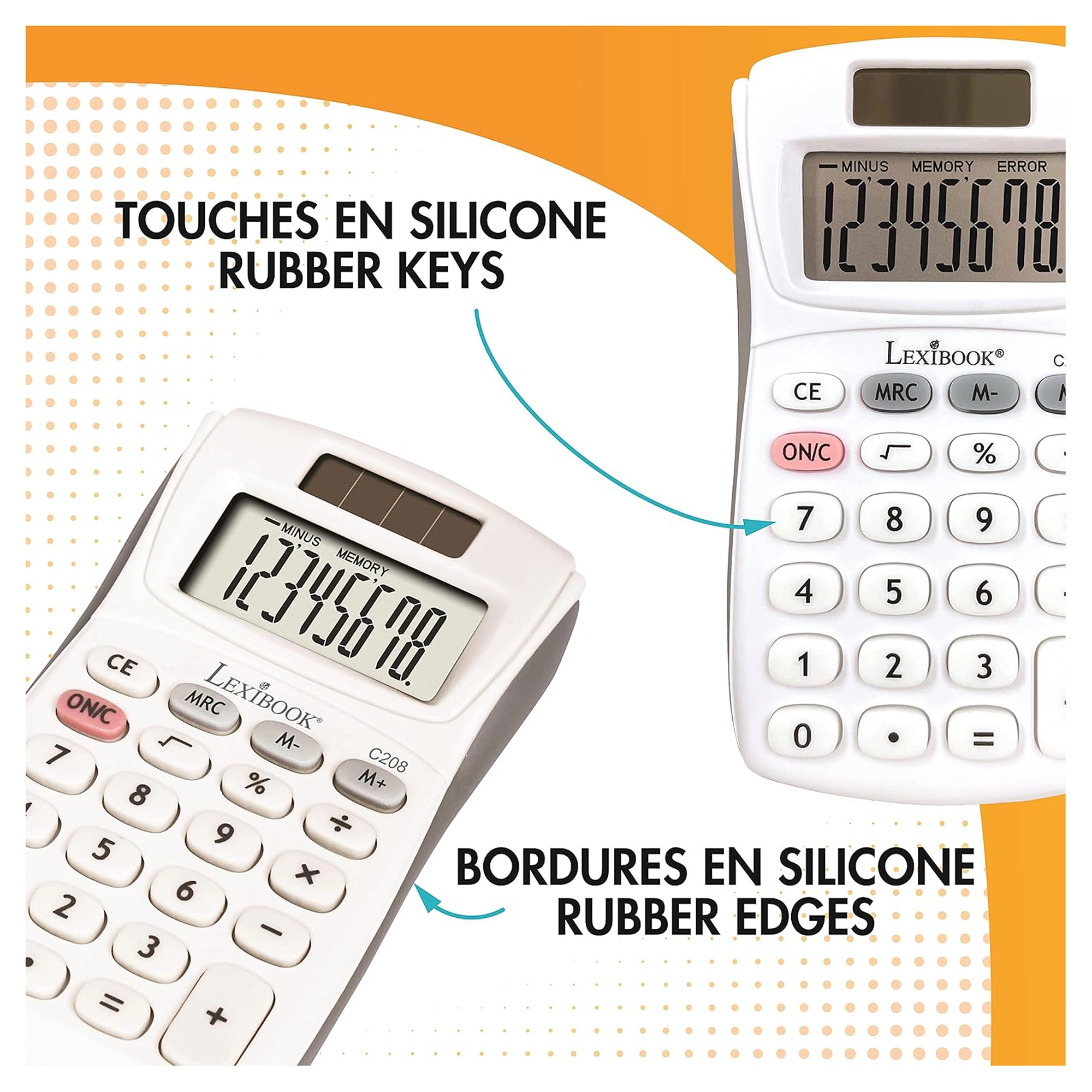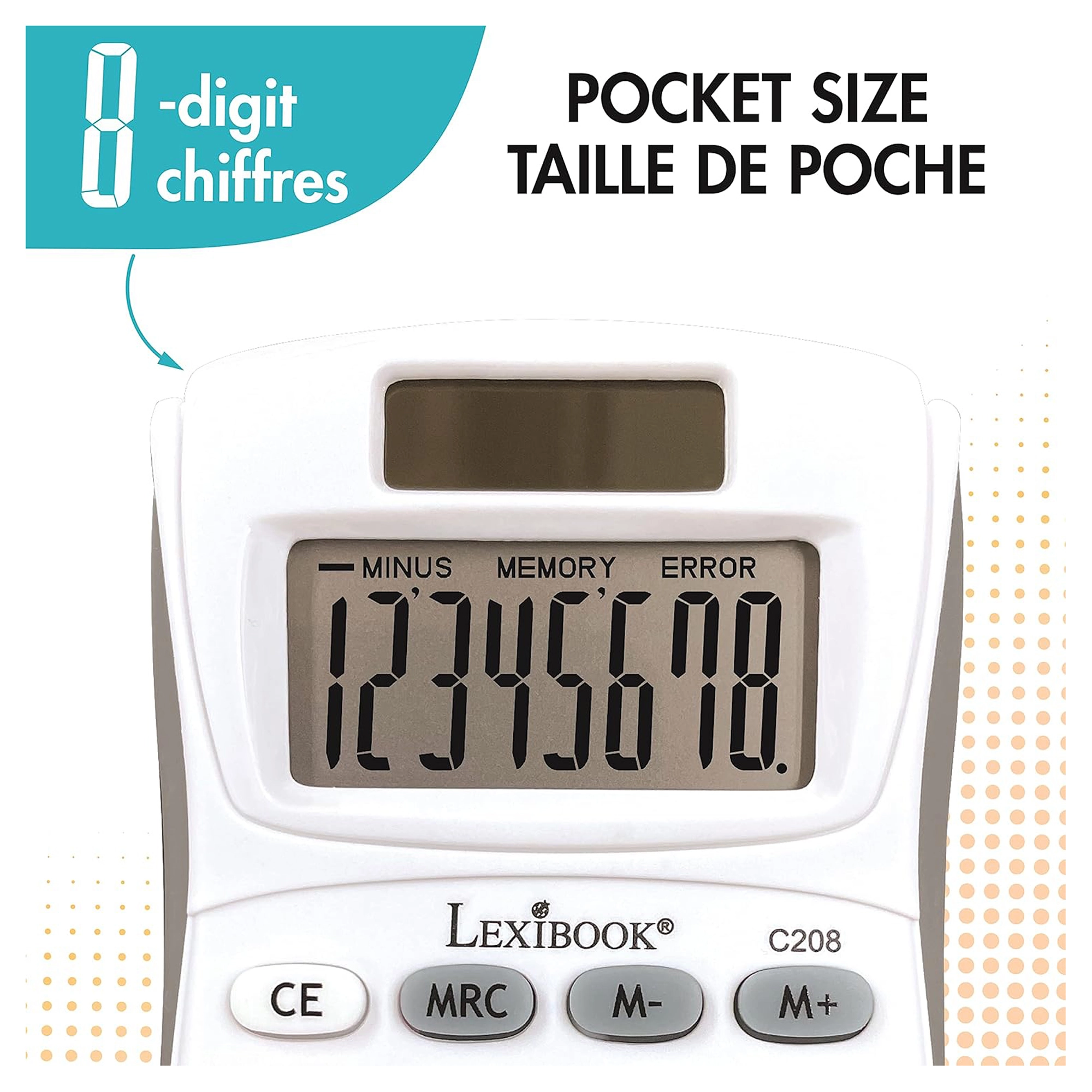 Kompaktní kapesní kalkulačka Lexibook s 8místným displejem nabízí solární napájení se záložní baterií, ergonomický design s pogumovanými okraji a přehledná barevná tlačítka pro pohodlné, rychlé a spolehlivé výpočty ve škole i doma.